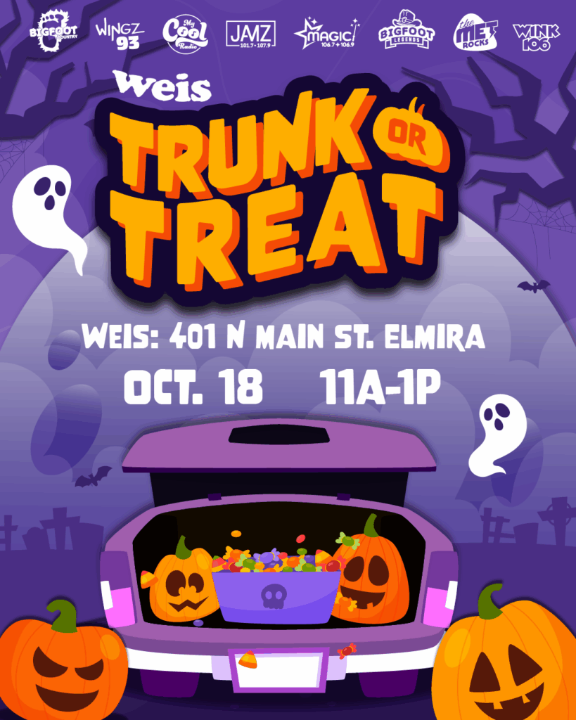 Bring the kids for a safe Trick or Treating event at the Weis Parking Lot in Elmira! On October 18th starting at 11a, we’ll have decorated trunks handing out candy to your little ghosts and goblins.